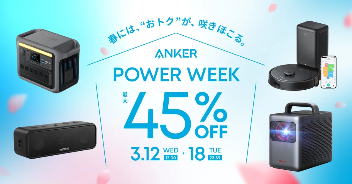 新たな生活を迎える季節がやってきました。転勤や引っ越しが多いこの春、生活を便利にするアイテムをお得に手に入れるチャンスが到来しました。ロボット掃除機やプロジェクターなど、便利でスタイリッシュな製品が揃った「Anker Power Week」が2025年3月12日(水)から開催されます。期間中はなんと200以上の製品が最大45%OFFとなり、手の届きやすい価格でお楽しみいただけます。