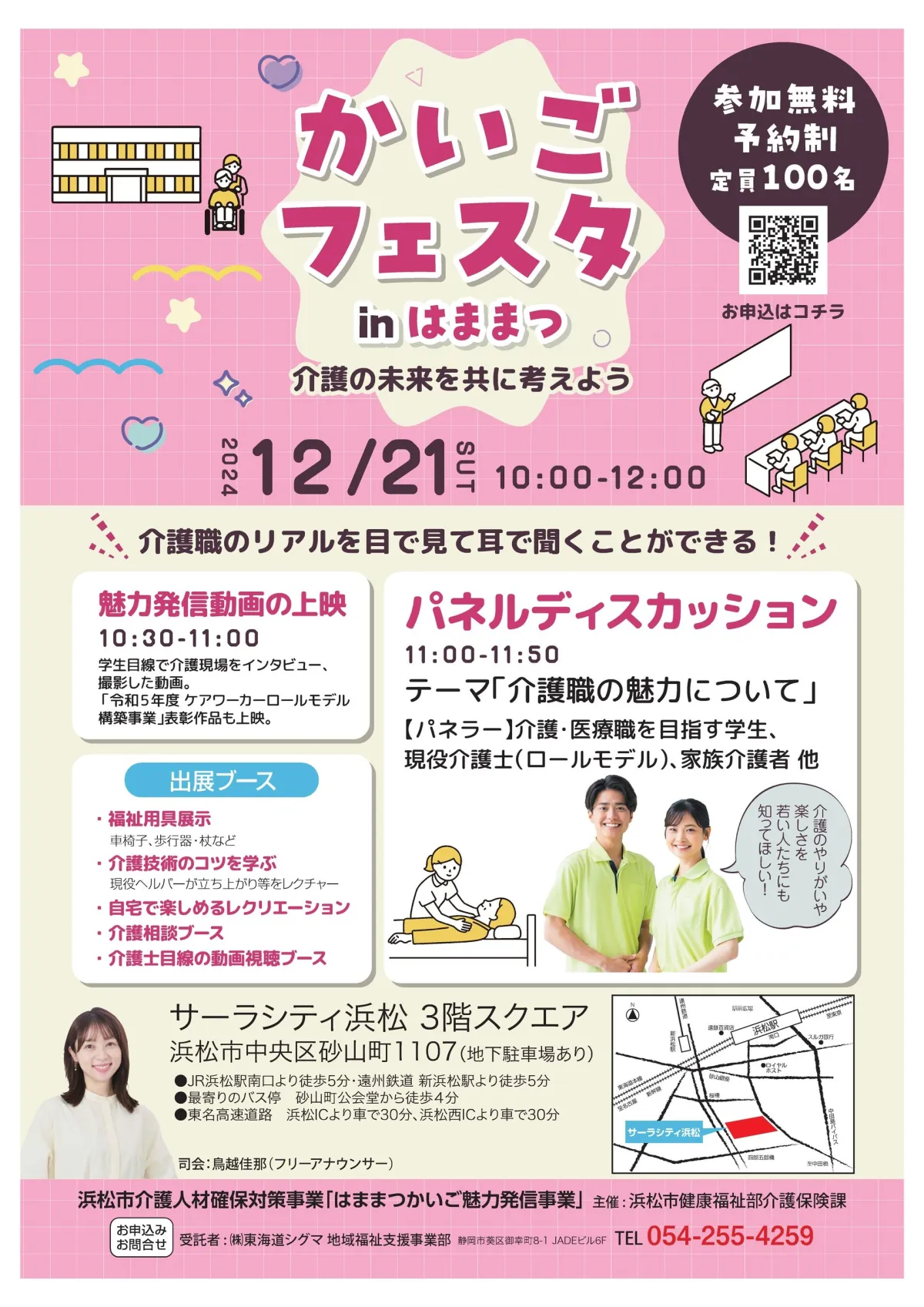 浜松市では、介護人材の確保や育成が今、重要な課題となっています。その現状を受けて、今年の12月21日(土)、「かいごフェスタinはままつ」がサーラシティ浜松にて開催されます。このイベントは、介護・医療職を目指す学生や現役の介護士が集まり、介護の魅力を広く一般の方々に伝える場として企画されました。