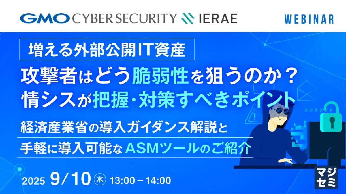 2025年7月に実施されたセミナーの再開催が決定しました。近年、急増するサイバー攻撃に属する脆弱性の検討を深める機会として、多くのリクエストに応じて本セミナーを開催します。デジタル技術の急速な普及に伴い、企業や組織は様々な外部に公開したIT資産を持つようになりました。これにより、サイバー攻撃を受けるリスクが高まっています。