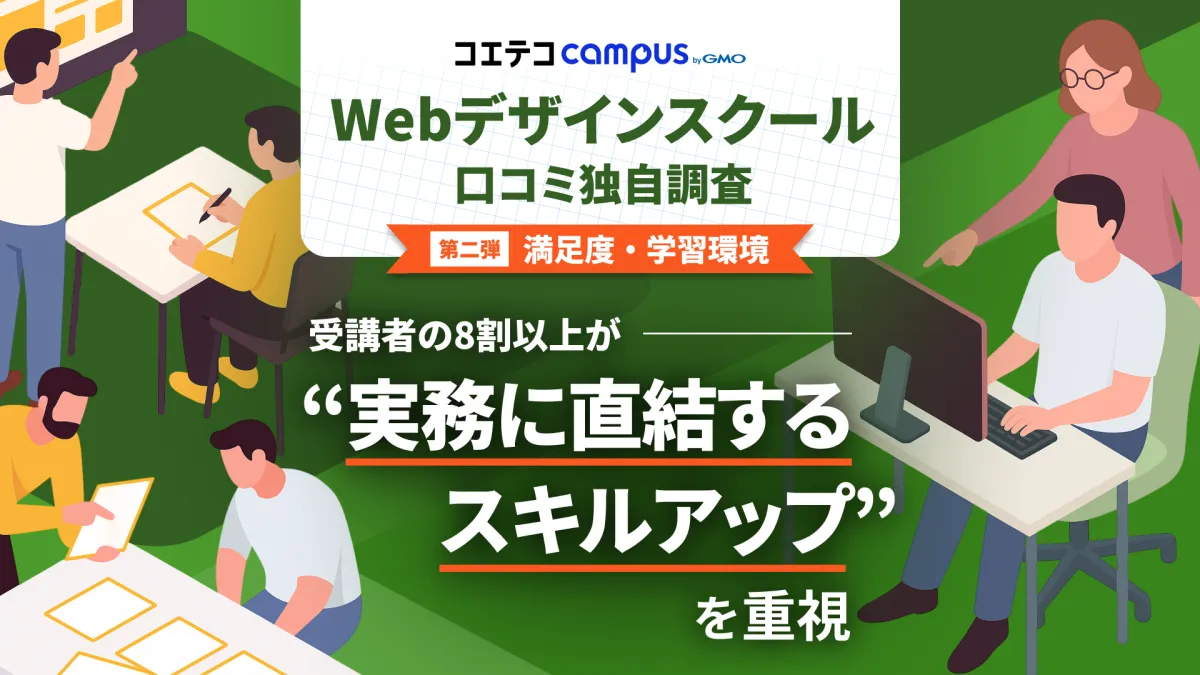 GMOインターネットグループのGMOメディア株式会社が運営するプログラミング・Webデザインスクール検索サイト「コエテコキャンパス byGMO」は、2024年に入会した249名を対象にWebデザインスクールの満足度や学習環境に関する調査を行いました。この調査は受講者が実務に直結したスキルアップをどのように重視しているのかを明らかにし、今後のスクール選びに役立てることを目的としています。