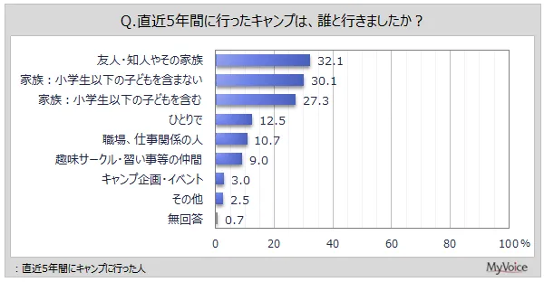 キャンプに行った際の同行者について尋ねたところ、「友人・知人やその家族」が32.1%で最も多く、次いで「家族:小学生以下の子どもを含まない」が30.1%、そして「家族:小学生以下の子どもを含む」が27.3%となっています。