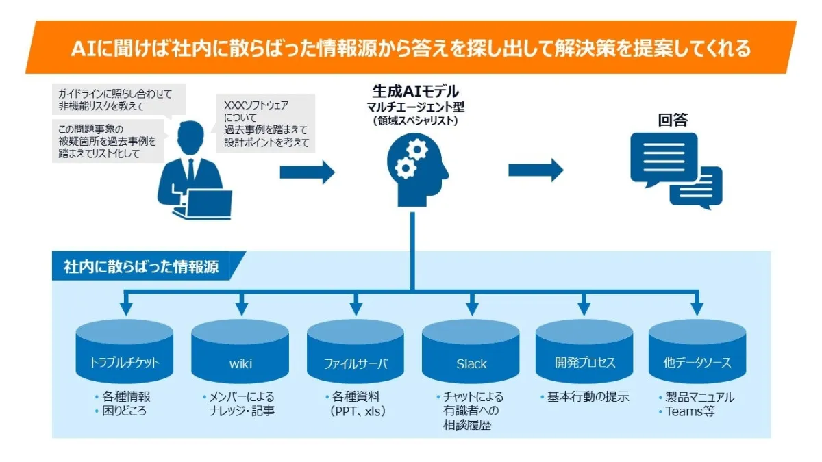 今回の取り組みでは、「まかせいのう」が長年にわたり蓄積してきた豊富なノウハウや暗黙知を活用するAIエージェントを開発します。このAIエージェントは、部内の様々な情報源から情報を統合し、的確な回答を提供することを目指します。これにより、コンサルタントは技術的な課題に対するサポートをAIエージェントから受けられるようになり、より自律的かつ効果的に問題解決に取り組むことが可能になります。