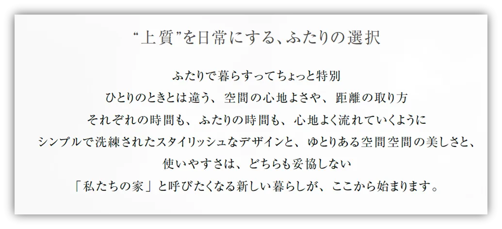 quador noieは、従来から入居者の快適性を追求してきた「quador」に新たに、“上質を日常にする、ふたりの選択”というコンセプトが加わりました。ふたりで暮らす空間に必要な設備や導線が整えられており、特にIoT技術を融合させた家電操作やスマートキーにより、忙しいふたりの生活を効率的にサポートします。