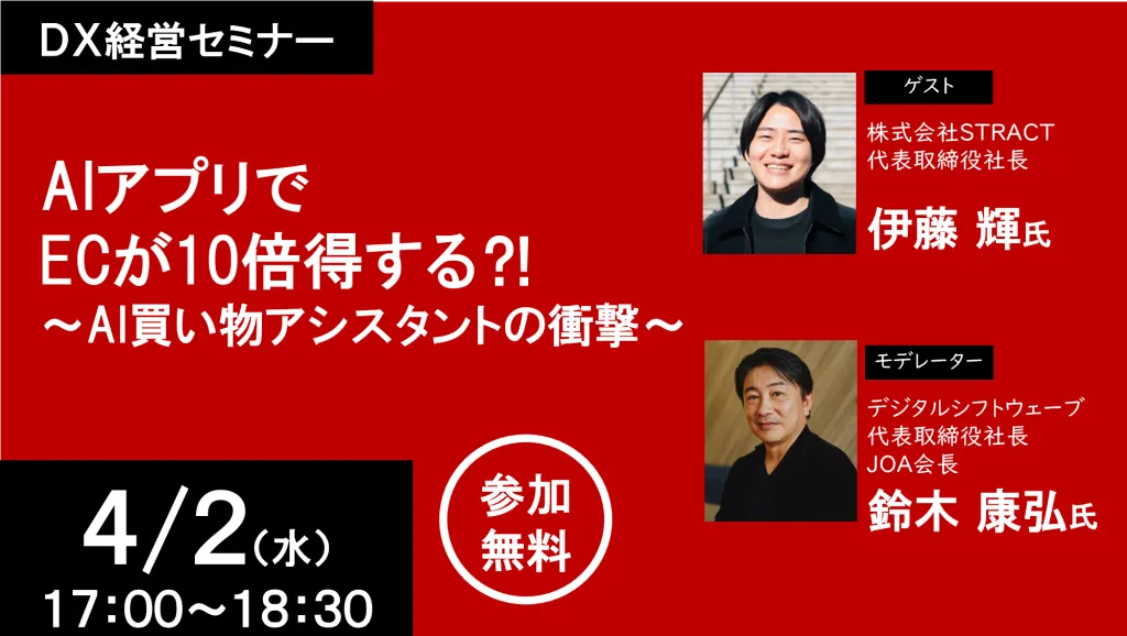2025年4月2日(水)、株式会社STRACTの代表取締役社長である伊藤輝氏が「DX経営セミナー」にて講演を行うことが決定しました。本セミナーのタイトルは、「AIアプリでECが10倍得する⁈~AI買い物アシスタントの衝撃~」。今回は、エコシステムが進化を続ける中で、どのようにAIが消費者の購買行動を変えるのかに焦点を当てます。