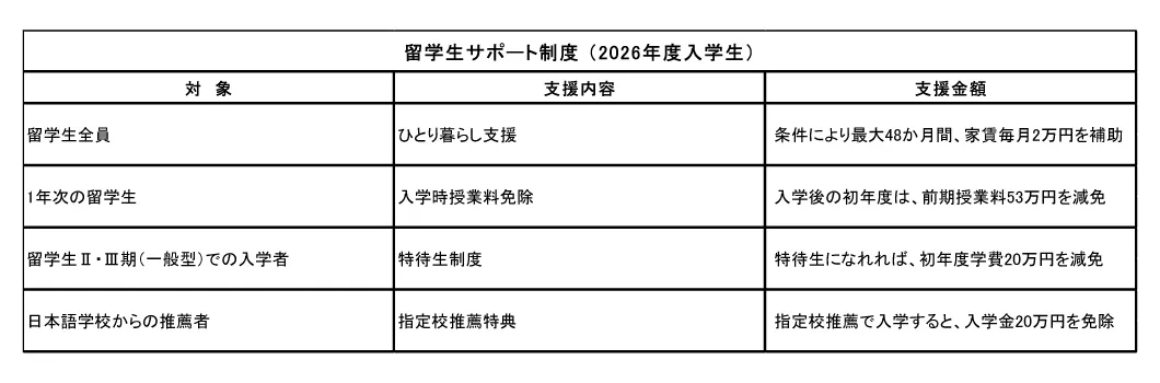 この制度では、入学時の授業料減免や毎月の住居費の支援が受けられます。さらに、特に優れた成績で入学試験を通過した留学生には、入学金の減免等が用意されています。留学生は、大学入学から教育、就職に至るまでの一連のプロセスをサポートされることとなります。これにより、日本企業にスムーズに就職できるような環境が整えられています。