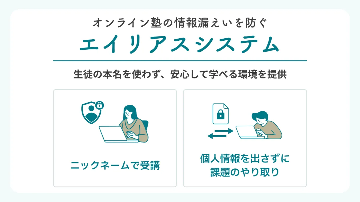 「エイリアス」とは英語で「別名」を意味し、このシステムでは生徒が本名ではなくニックネームを使用してコミュニケーションを取る仕組みです。主要な運用の柱は以下の二つです: