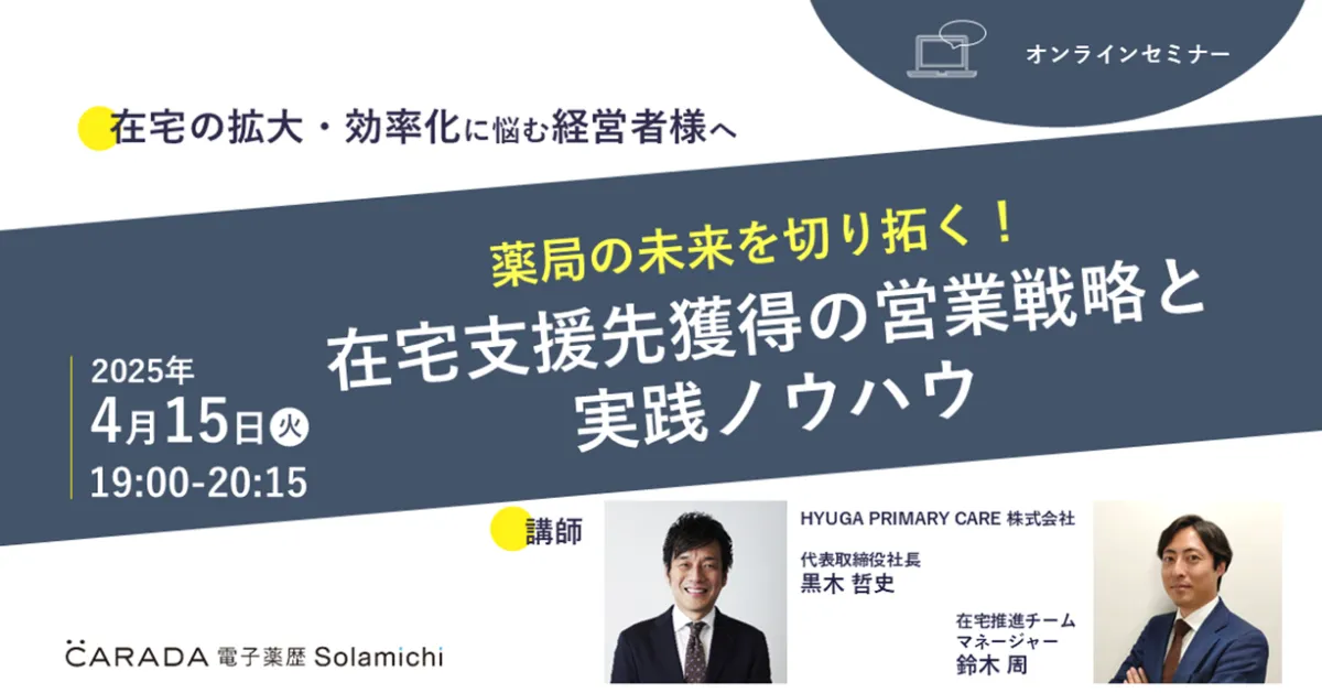 株式会社ソラミチシステムは、薬剤師による在宅医療とそのサポート事業を展開しているHYUGA PRIMARY CARE株式会社の代表、黒木哲史氏とマネージャーの鈴木周氏をゲストに迎え、無料のオンラインセミナー「薬局の未来を切り拓く!在宅支援先獲得の営業戦略と実践ノウハウ」を4月15日(火)19時より開催します。本セミナーは、過去2月と3月にも実施され、非常に好評だったための追加開催です。参加者はこの貴重なチャンスをぜひお見逃しなく!