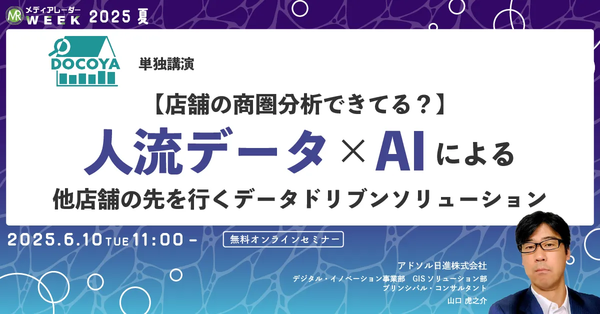 株式会社アイズが主催する「第18回メディアレーダーWEEK 2025 夏」において、アドソル日進株式会社が登壇し、最新の商圏分析手法を紹介します。本セミナーは、2025年6月10日(火)11:00からオンラインで行われ、参加は無料です。このセミナーでは、人流データとAIを組み合わせたツール「DOCOYA」の活用方法について詳しく解説します。