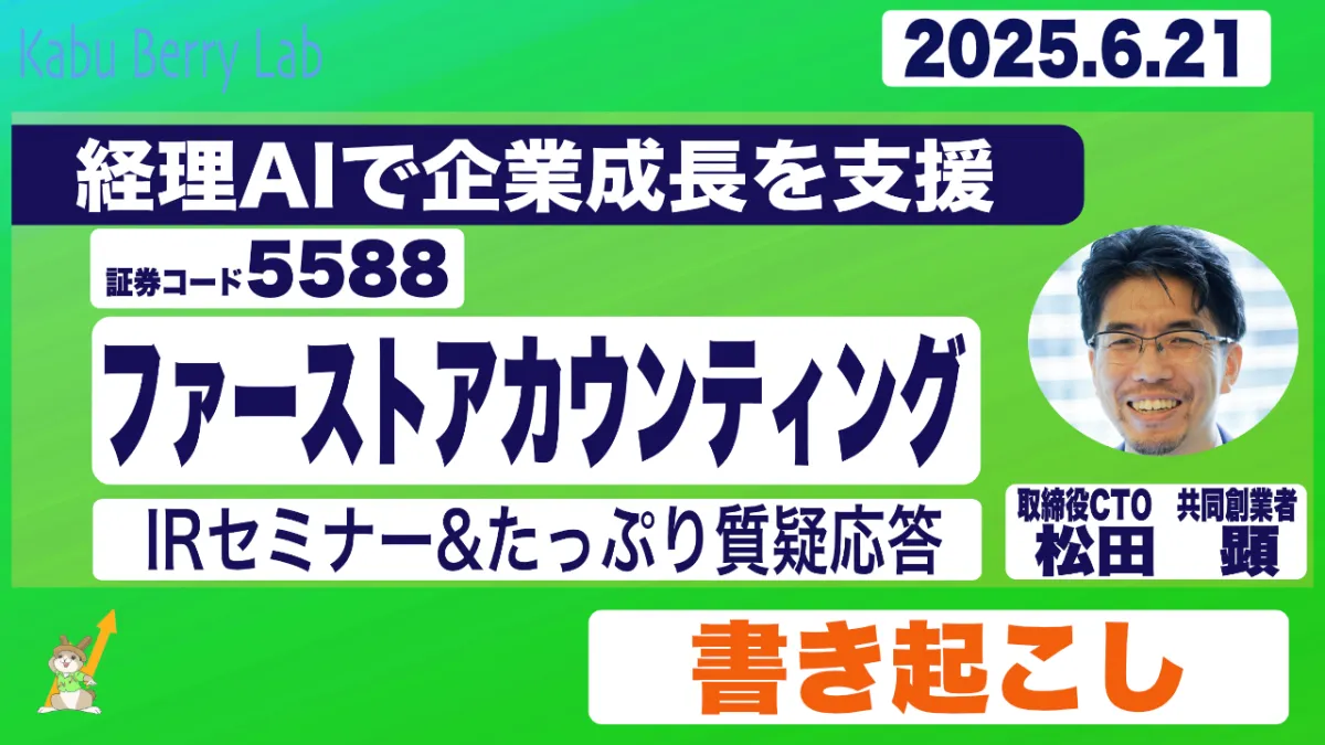 2025年6月15日、ファーストアカウンティング株式会社が名古屋にて開催された「Kabu Berry主催・個人投資家向けIRセミナー」にて登壇しました。このセミナーでは、同社の事業の内容や成長戦略から、特に生成AIを使った経理業務の自動化に関するプレゼンテーションが行われました。