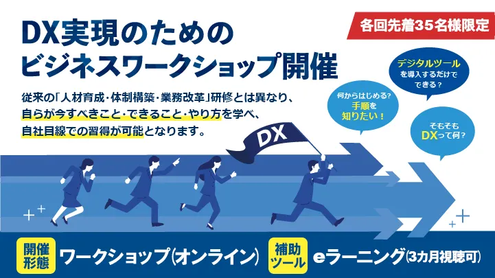 このワークショップでは、参加者が100分間のグループワークを通じて、自社でのDX推進に必要な知識や技術を学びます。特に、中小企業にとってデジタル化は避けて通れない課題であり、これを乗り越えるための実践的なノウハウを提供します。さらに、参加者には、DXスタートアップに役立つeラーニングを3か月間無料で視聴できる特典も付いています。