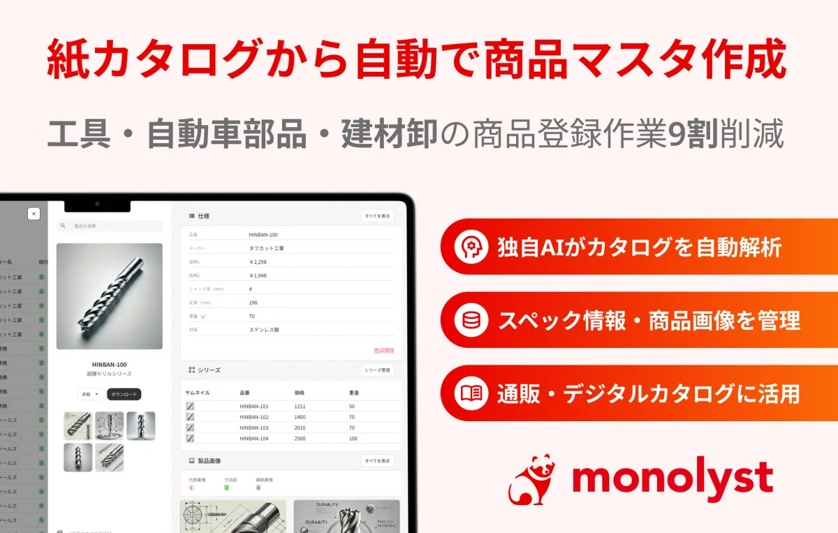 「monolyst」は、工具卸業界にとどまらず、建材卸や自動車部品卸など、さまざまな業種での活用が期待されています。具体的には、紙カタログの情報転記やスペックのデジタル化、ウェブ受注システムの整備など多岐にわたります。