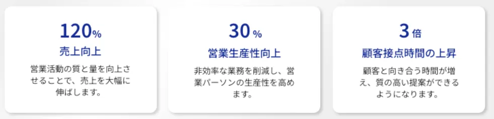 これにより、営業担当者はノンコア業務を大幅に削減され、顧客対応や商談に集中する環境を整えることができます。これにより、追加人材を採用することなく営業力を1.5名分強化し、売上を120%まで引き上げられるのです。
