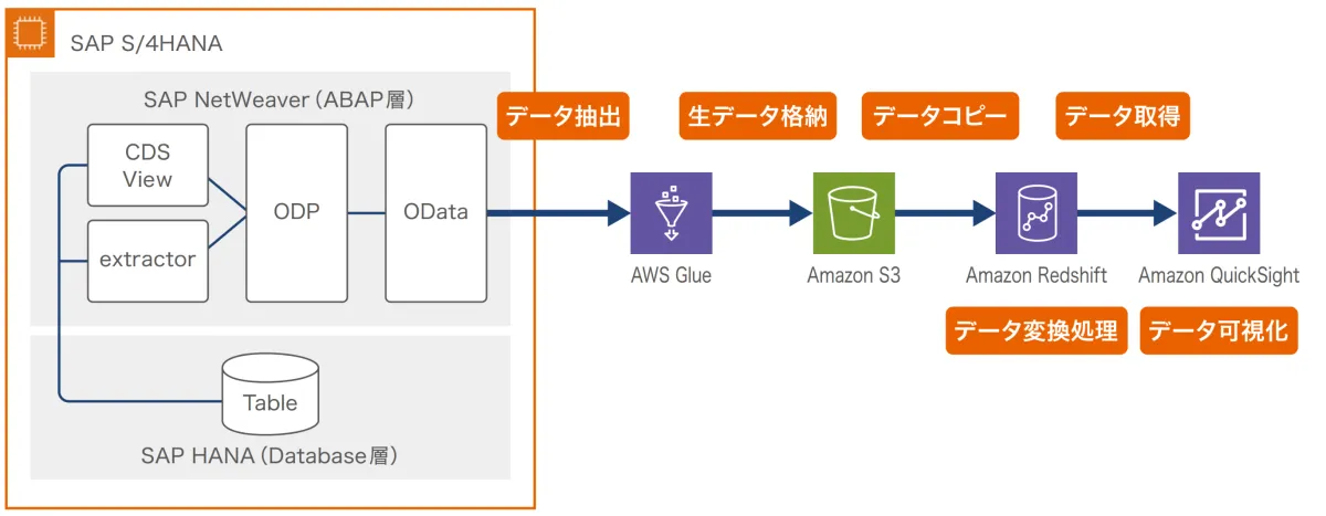 このソリューションの中心となるのは、AWS GlueのSAP ODataコネクタです。これを利用することで、SAP S/4HANAやSAP ECC 6.0からデータをAWSの分析基盤へ効果的に抽出し、蓄積することができます。そして、蓄積されたデータは、Amazon QuickSightなどのBIツールを用いて、視覚的かつ直感的に分析可能になります。外部データとの統合分析やAIを活用した洞察も行えるため、ユーザーはデータからより深い理解を得ることができます。