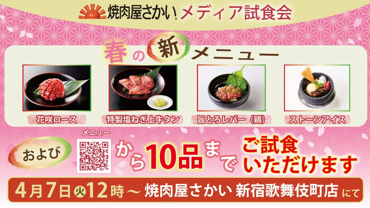 試食会は正午12時から午後2時までの予定で、受付は11時30分から。会場である「焼肉屋さかい 新宿歌舞伎町店」には、焼肉とともに新提供する春の特別メニューが登場します。参加者には、メニューの中から10品を選んで試食できるほか、撮影も行うことが可能です。