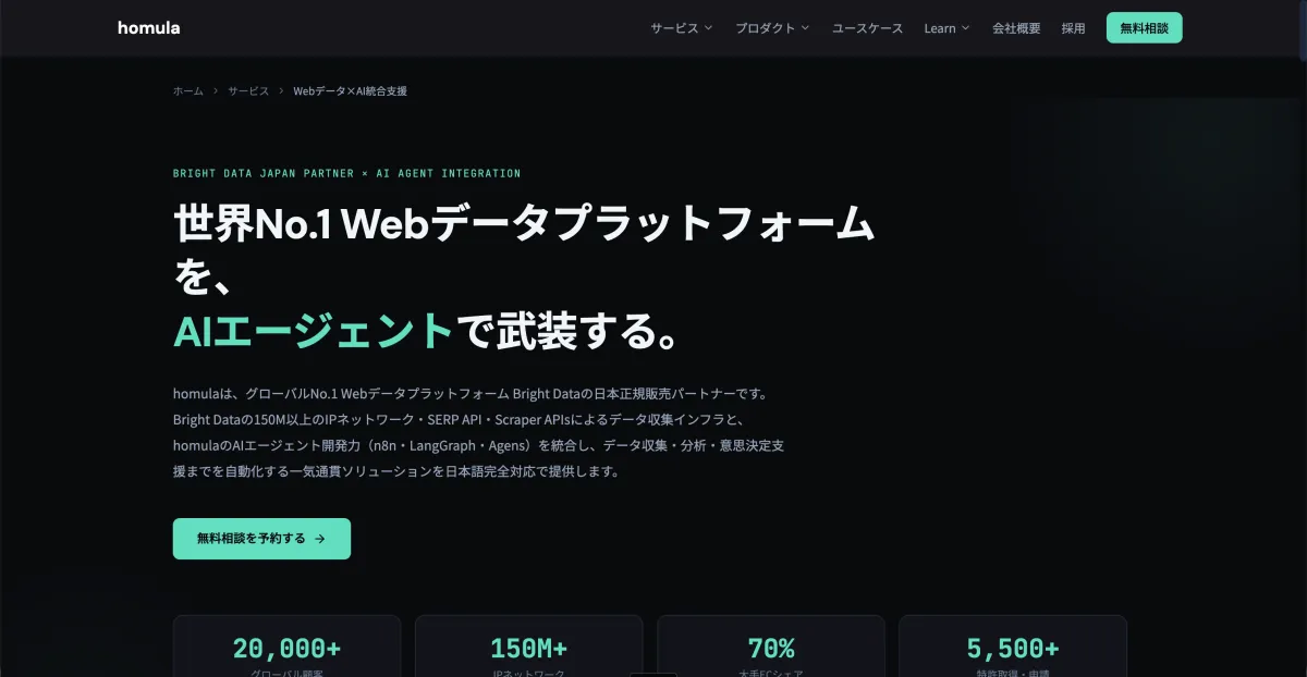 homulaは、Bright Dataが提供するWebデータの日本企業向けライセンス販売を行い、導入支援や技術サポートを実施します。