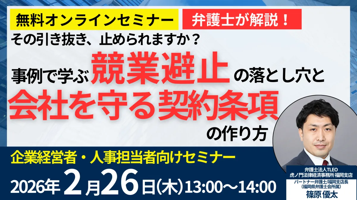 企業経営者や人事責任者向けに、弁護士法人TLEO虎ノ門法律経済事務所が主催するオンラインセミナー「その引き抜き、止められますか?事例で学ぶ『競業避止』の落とし穴と、会社を守る契約条項の作り方」が、2月26日(木)に開催されます。