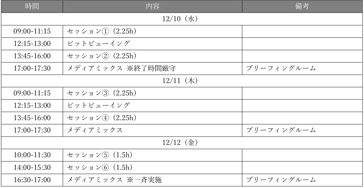 合同テストは12月10日と11日、12日の3日間にわたり行われます。特に、10日と11日のメディアミックスは厳格な時間管理が求められています。入れ替え制で前後15分ごとのタイミングで入れ替わるため、速やかに取材を進める必要があります。