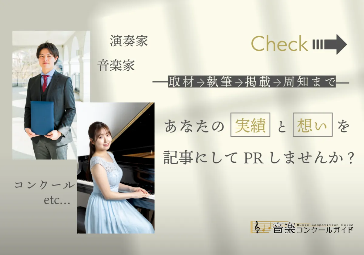 このPRサービスは、音楽に関わる各関係者の名前入り特集記事を制作・掲載します。具体的には、演奏者や音楽家、教育者、審査員、主催者が自身の活動やメッセージを広く届ける機会を提供します。記事作成にあたっては、各人の背景や選曲意図、理念など、これまで伝えきれなかった情報を整理し、一般の読者にもわかりやすく表現します。