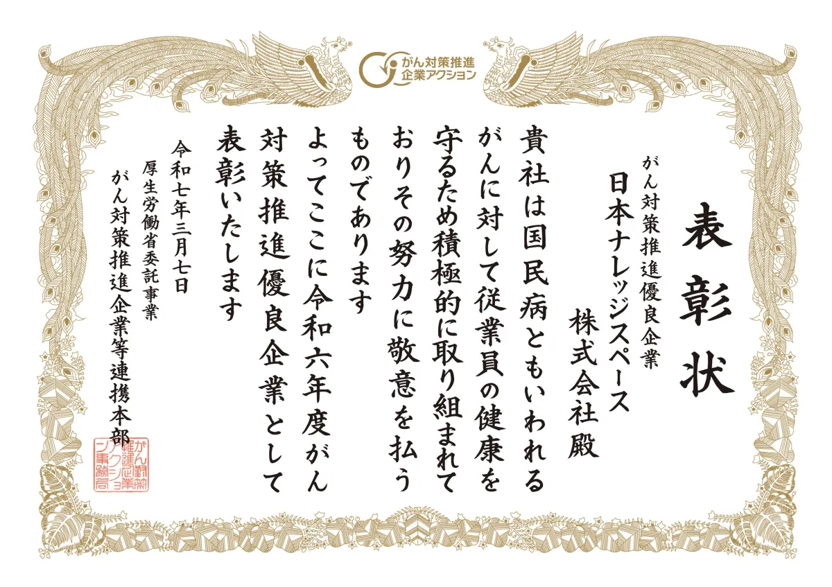 日本ナレッジスペース株式会社(以下、当社)は、厚生労働省が制定する「がん対策推進優良企業」として、令和6年度に4年連続で表彰されました。この栄誉は、がん対策の重要性を考慮し、企業としての社会的責任を果たすべく実施してきた様々な取り組みが高く評価された結果です。