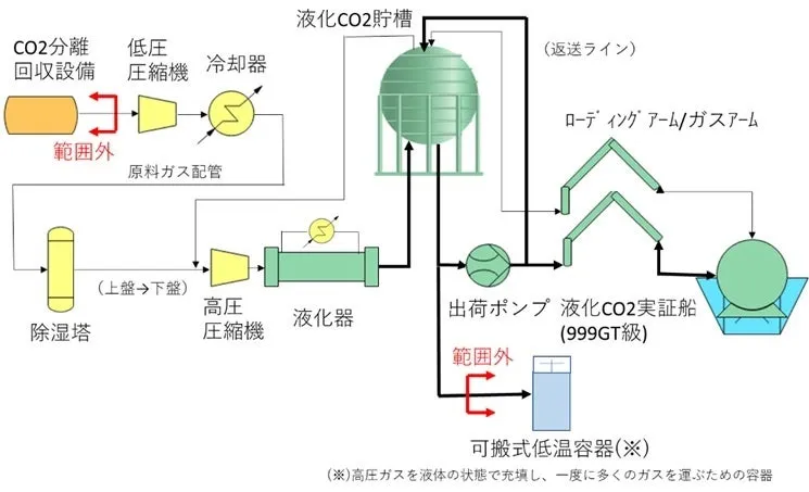 特に、現行の液化技術では中温・中圧条件(温度:-20℃、圧力:2.0Mpa)が必要ですが、今回のプロジェクトでは低温・低圧条件(温度:-50℃、圧力:0.7Mpa)での実証が行われ、安全で効率的なCO₂輸送が実現できる技術の確立が期待されています。