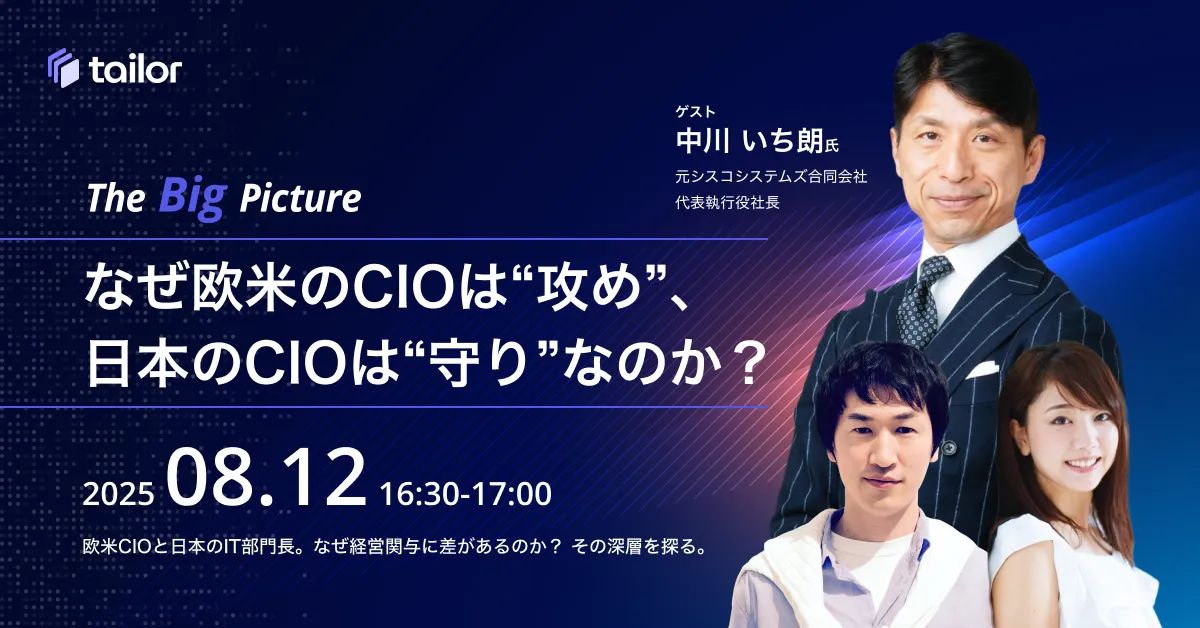 テイラー社は、デジタルトランスフォーメーション(DX)の全体像を浮き彫りにするための対談形式ウェビナー「The Big Picture」をスタートします。このシリーズでは、日本を代表する企業の最高情報責任者(CIO)や有力ベンダー企業のリーダーをゲストに招き、柴田陽代表がIT戦略や組織づくりに関する知見を深く掘り下げていきます。初回の配信は2025年8月12日(火)16時30分から17時を予定しています。