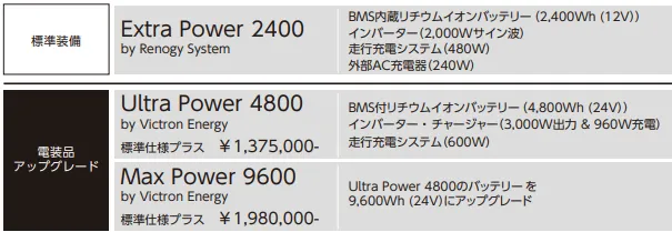 「Liberty52DBi」では、新たにリン酸鉄系リチウムイオンバッテリーが標準装備されています。これまでの三元系バッテリーに比べ、安全性が格段に向上しており、消費者のニーズに応じて大容量オプションも選べるようになっています。標準で4800WhのULtra power、さらに4倍のMax powerもオプション提供。このアップグレードにより、使用者は安心して長時間の使用が可能です。
