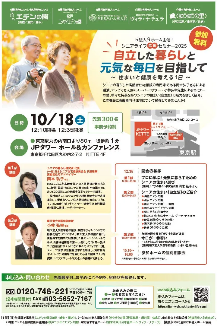 2025年10月18日(土曜日)、東京の丸の内にあるJPタワー ホール&カンファレンスにおいて、「シニアライフ応援セミナー2025」が開催されます。このイベントは、シニア世代を対象とし、住まい選びや健康づくりに関する情報を提供するために東京都住宅供給公社(JKK東京)をはじめとする四つの法人が共催しています。