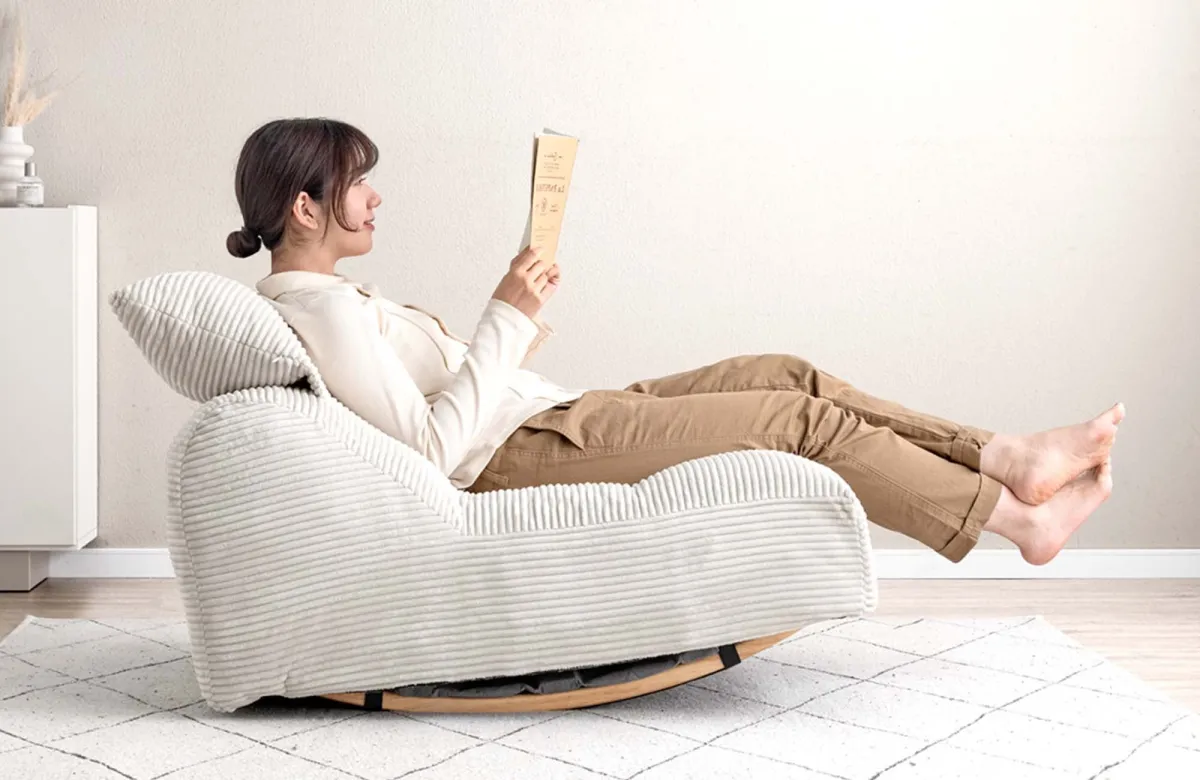 このソファにはロッキング機能が搭載されており、身体を自然に揺らしてくれます。この微細な揺れがリラックスを促進し、本能的に安心感を与えます。姿勢を変えやすく、長時間同じ姿勢でいることによる身体への負担を軽減し、快適に過ごせる時間を提供します。お子様が遊んでいる間や、映画鑑賞、読書にも最適なアイテムです。