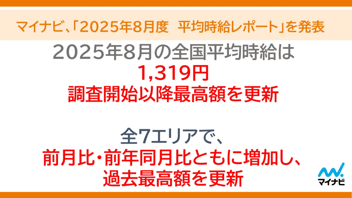 株式会社マイナビが2025年8月のアルバイト・パート平均時給レポートを発表しました。全国平均時給は1,319円に達し、調査開始以降の最高額を記録したことが明らかになりました。この増加は社会全体で労働条件の見直しが進んでいることを示唆しています。