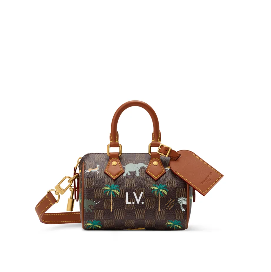 新たに発表されたバッグは、まず「LV × ザ・ダージリン リミテッド スピーディ・バンドリエール 18」。このアイテムは、ダミエ・ヘリテージキャンバスを素材に製作され、野生動物と鮮やかな「L.V.」イニシャルが特徴的です。サイズはW 18 x H 12 x D 10 cmで、価格は404,800円。このコンパクトなデザインは非常に実用的でありながら、ルイ・ヴィトンのクラシックなスタイルを感じさせます。