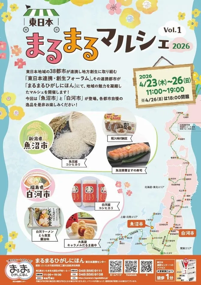 「東日本まるまるマルシェ2026 Vol.1」は、地域の魅力が集結するイベントです。特産品の販売はもちろん、各地域の文化や人々との交流を通じて、新たなつながりや発見があることを期待しています。この春、ぜひさいたま市で開催されるこのマルシェに足を運んでみてはいかがでしょうか。