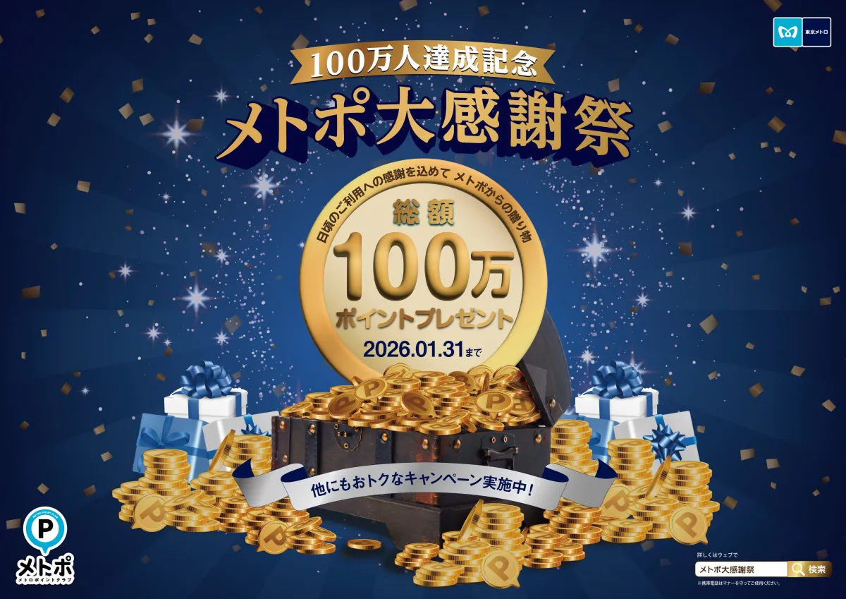東京地下鉄株式会社(東京メトロ)が、メトロポイントクラブ(メトポ)の会員数が100万人を突破したことを祝して、「メトポ大感謝祭」を2025年12月5日から2026年1月31日までの期間に開催します。このキャンペーンは、日頃からメトポをご利用いただいている会員の皆様への感謝の気持ちを表すものです。