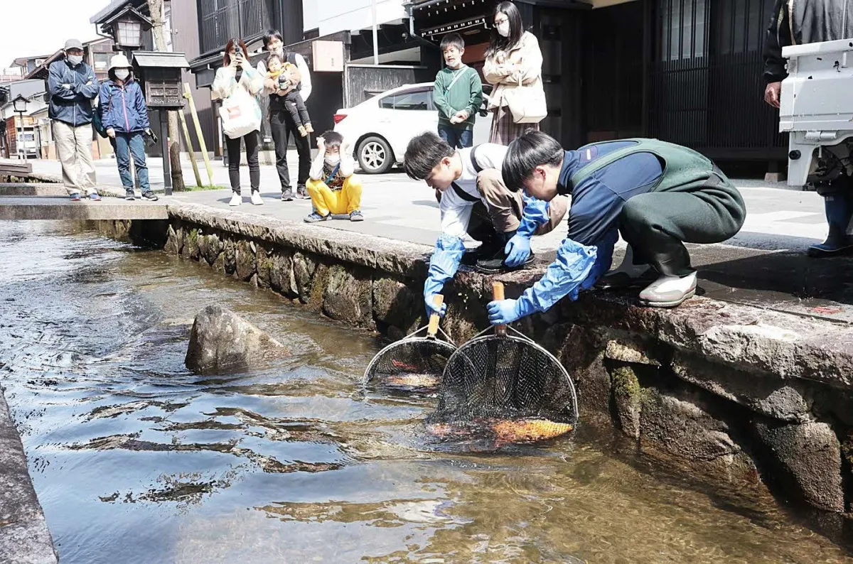 毎年11月に鯉は近くの天神池に移され、そして4月に元の瀬戸川に戻ります。この季節の変わり目を祝うために、飛騨市観光協会や地元の中学生たち、ボランティアの方々が早朝から集まります。