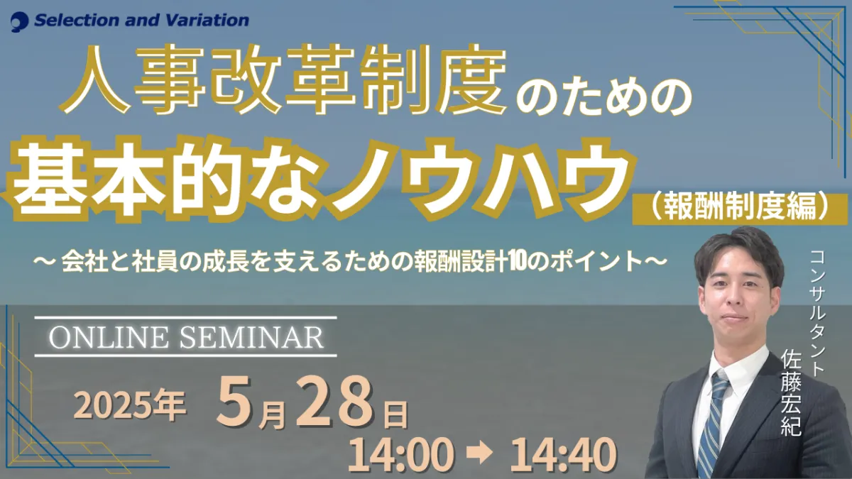 人事制度の見直しは、企業が成長するために不可欠なプロセスです。特に、現在のVUCA時代において、変化する外部環境に適応するための課題が山積しています。成果やスキルに基づく公正な報酬制度を構築することは、若年層の早期離職を防ぐためにも重要です。これを受け、セレクションアンドバリエーション株式会社では、2025年5月28日に「報酬制度編」というテーマで、オンラインセミナーを開催します。