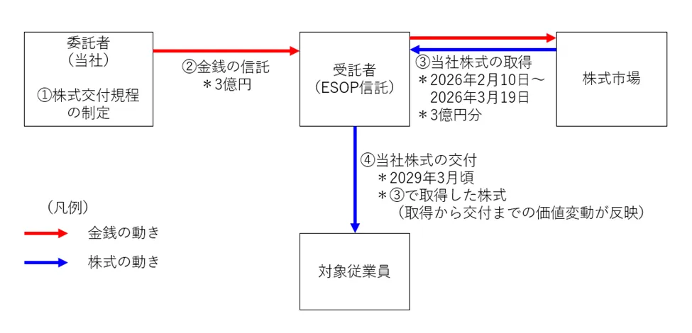 信託契約は2026年2月5日に締結予定で、制度自体はそこからスタートし、2026年2月5日から2029年3月31日までの期間が定められています。このように、長期的な視点での資産形成を目的とした制度であるため、従業員のモチベーション向上にも寄与することが期待されています。