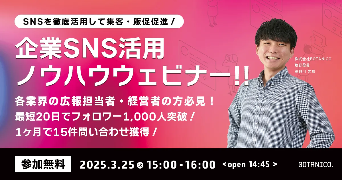 株式会社BOTANICOが主催する特別なセミナーが、3月25日に開催されます。このセミナーは、広報やSNSを担当している方々、そして経営者を対象にしたものです。最新のSNS活用方法を学び、ビジネスを成長させるための貴重な機会となっています。