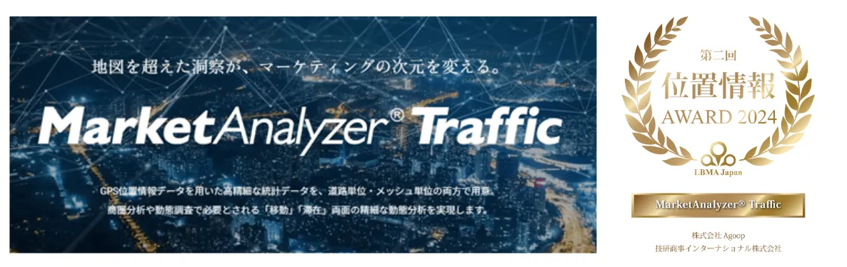 受賞した「MarketAnalyzer® Traffic」は、技研商事の商圏分析GIS「MarketAnalyzer® 5」と、Agoopが提供する道路単位の通行量データおよび滞在データを組み合わせた先進的なGISソリューションです。このツールは、全国2000社以上へ導入実績があり、企業が保有するデータや公的統計、さまざまなオルタナティブデータと位置情報を組み合わせることができ、高度な分析を支援します。
