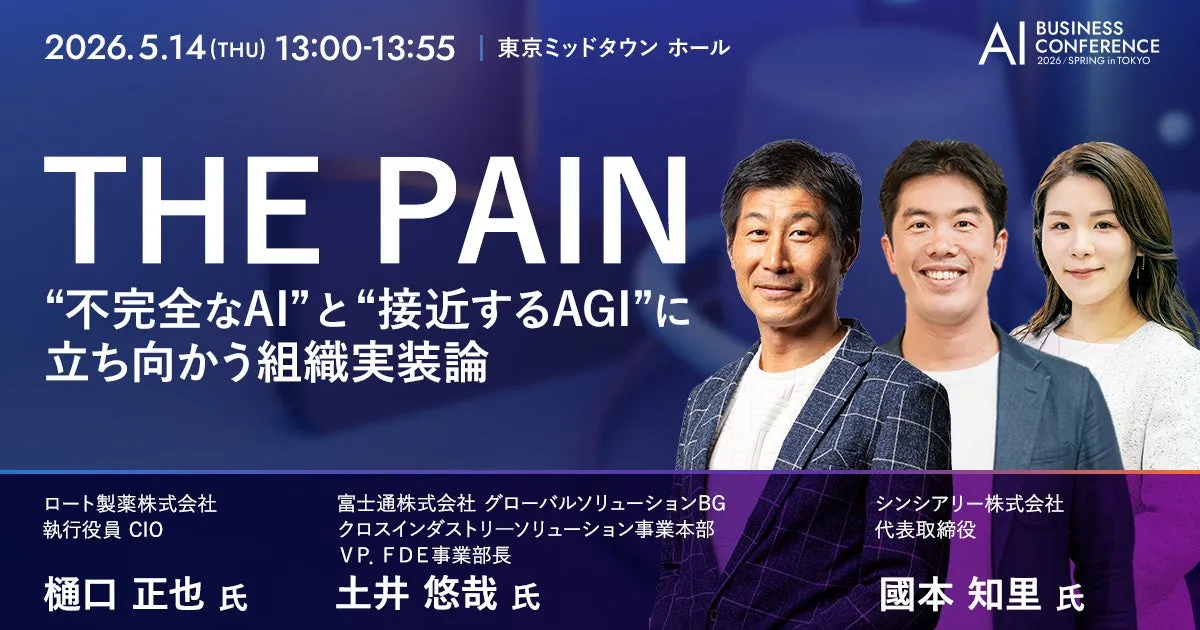 「AI BUSINESS CONFERENCE」では、セミナーやワークショップを通じて参加者がAI活用の実践的なノウハウを得ることができます。登壇者には、ロート製薬の樋口正也氏、富士通の土井悠哉氏が名を連ね、AGI(汎用人工知能)時代における企業のAI導入と組織変革に関する重要な議論が交わされる予定です。