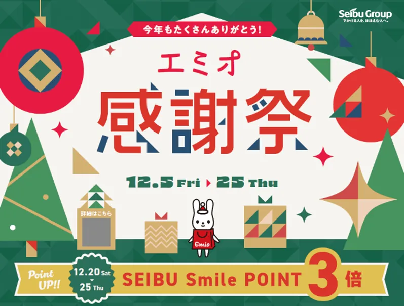 「エミオ感謝祭2025」は、12月5日から14日までの10日間を中心に、各店舗でお得な商品やクリスマス向けのアイテムが取り揃えられます。この期間中には、笑顔のアイコン「SEIBU Smile POINT」の特別還元デーも設けられ、ポイントが通常の2倍から3倍に増える日もあります。