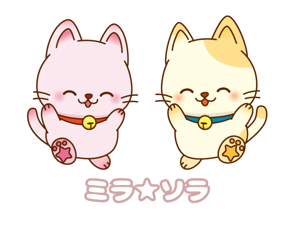「ミラ」はピンクの猫で、未来や明るい未来をイメージした名前です。その性格はおしゃべり好きで明るく、しっかり者として知られています。一方、「ソラ」は黄色の猫で、空や星にちなんだ名前です。マイペースながらも頼りがいのある存在で、星を見ることが大好きです。この2匹のキャラクターが持つ特性が組み合わさることで、未来に向かって広がる空を象徴する双子の子猫というメッセージが込められています。