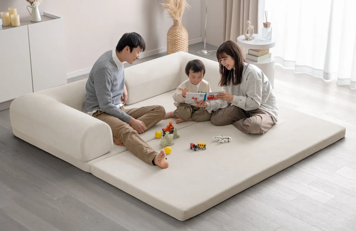 『折りたたみ組み換えソファ』の最大の特徴は、L字クッションを自由に配置できる点です。これにより、好みのスタイルに応じたレイアウトが可能となり、場面に応じた色々なくつろぎ方を楽しめます。クッションを使って向かい合わせに座ったり、トランプなどのゲームを楽しむためにスペースを作ることもできます。