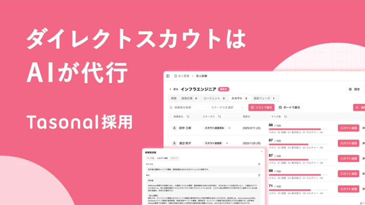 「Tasonal 採用」は、各企業が求める人材要件に適した候補者を自動で抽出し、さらにその候補者に向けて魅力的なスカウト文を生成・送信するサービスです。これにより、採用業務の効率化だけでなく、企業が求める人材の獲得スピードも飛躍的に向上します。