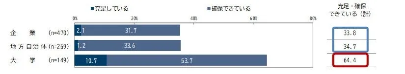 調査によると、大学は比較的人材確保が順調であり、確保状況は充足しています。一方、企業に関しては、大企業と中小企業の間に人材の採用及び離職状況において二極化が見られました。約30%の企業は採用が可能で離職率も改善傾向にありますが、同様に30%は採用が難しく離職率が増加しているという厳しい現状があります。