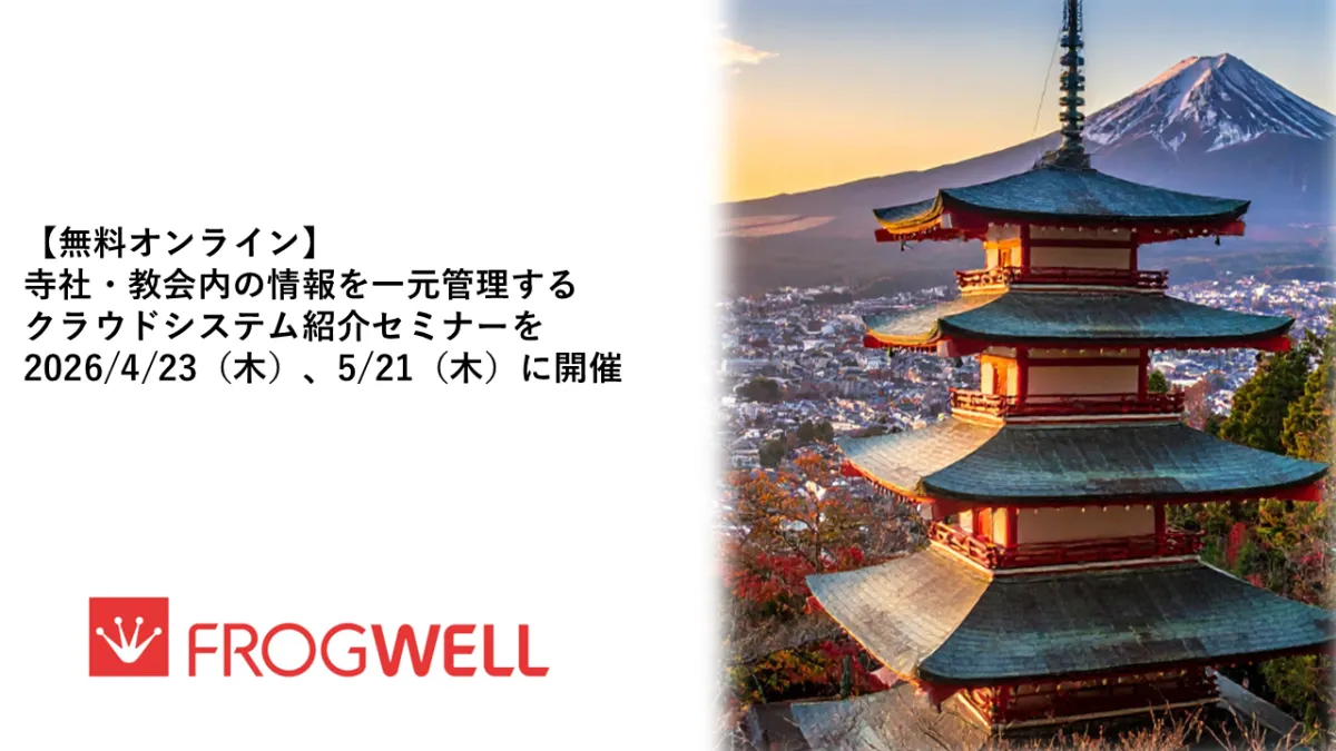 2026年4月23日(木)と5月21日(木)に開催される本セミナーは、オンライン形式で行われ、参加者は事前に申し込みを行う方式です。現代の宗教法人に求められるのは業務効率の向上や情報の透明性。多くの組織が情報管理をExcelなどで行っている中、フロッグウェルが提案するクラウドシステムは、業務にまつわる情報を一元的に管理できる群を抜いたソリューションです。