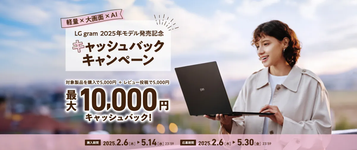 このキャンペーンは、2025年2月6日(木)から5月14日(水)までの購入期間と、応募期間は2025年2月6日(木)から5月30日(金)までとなっております。この機会にこそ、最新の「LG gram」モデルをお得に手に入れてみてはいかがでしょう。