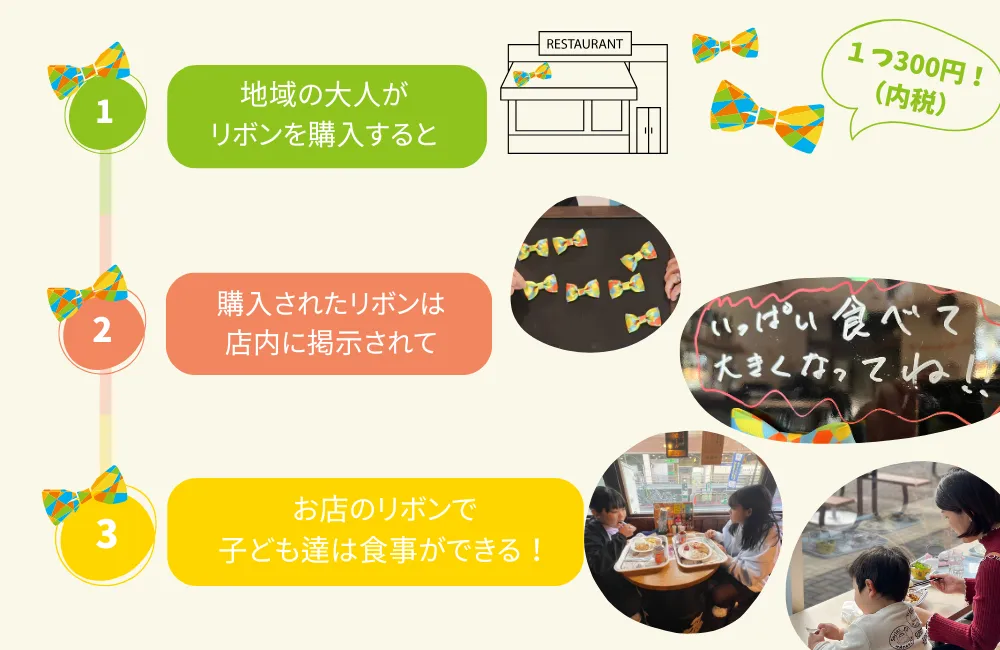 フードリボンプロジェクトは、地域の飲食店が「フードリボン」を販売する形式をとっています。顧客が1つ300円のリボンを購入し、店舗内に掲示することで、困っている子どもたちがそのリボンを取って、お店の人に渡すことによって、1食分の無料の食事を受けられる仕組みです。この取り組みは、子どもたちがいつでも助けを求められる場所を提供し、地域全体で支え合うコミュニティの形成にも寄与しています。