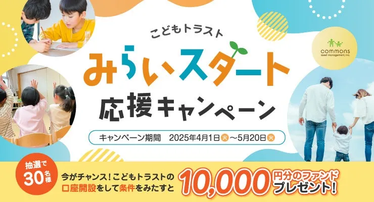 コモンズ投信株式会社が2025年4月1日から5月20日まで実施する「みらいスタート応援キャンペーン」。このキャンペーンは、こどもトラストの口座を新たに開設し、所定の条件を満たした0~18歳未満の参加者を対象に、抽選で30名に1万円分のファンドがプレゼントされるというものです。この取り組みは、未来に対する信頼を育むことを目指し、特に子どもたちに向けた資産形成の重要性を実感してもらうためのものです。