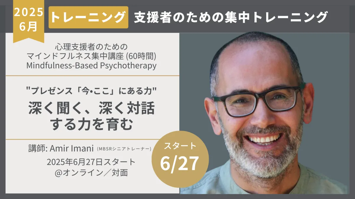 また、講師のAmir Imaniから、臨床研究によって示されたプレゼンスや関係性の質がクライアントの回復に与える影響についても学べます。このワークショップでは、マインドフルネスや慈悲の実践を通じて、深く耳を傾ける力を養います。