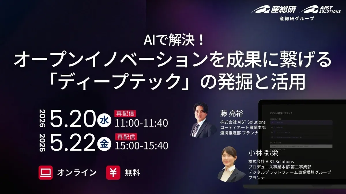 この機会に、ぜひ産総研の無料オンラインセミナーをご覧ください。技術探索のプロセスを変革するヒントが得られるはずです。