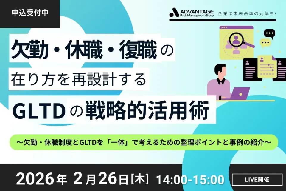 株式会社アドバンテッジリスクマネジメントは、2026年2月26日(木)にWebセミナー「欠勤・休職・復職の在り方を再設計するGLTDの戦略的活用術」を行います。このセミナーでは、欠勤や休職制度の最近の動向を踏まえ、団体長期障害所得補償保険(GLTD)をどのように活用するかについて、事例を交えながら詳しく解説します。